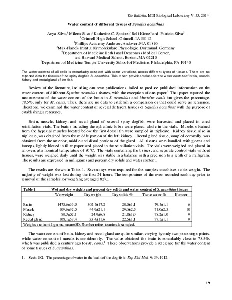 Water Content of Different Tissues of Squalus acanthias Identifier: 12941 Title: Water Content of Different Tissues of Squalus acanthias Author: Anya Silva, Grinnell High School" Milena Silva, Phillips Academy Andover Katherine C. Spokes, Harvard University Rolf Kinne, Max-Planck-Institut Patricio Silva, Temple University Date: 2013 Species: Squalus acanthias Common Name: Spiny dogfish Type: Bulletin, Report Bulletin: Volume 53 - 2013 Report: 10 Citation “Water Content of Different Tissues of Squalus acanthias,” MDI Biological Laboratory, accessed December 14, 2025, https://digitalarchive.mdibl.org/items/show/1197.Item 12941 Save this item as a PDF file
