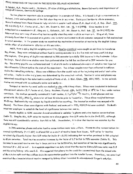 Renal Handling of Taurine in the Dogfish Squalus acanthias Identifier: 11346 Title: Renal Handling of Taurine in the Dogfish Squalus acanthias Author: Helmut Schrock, Brown University Roy P. Forster, Dartmouth College Leon Goldstein, Brown University Date: 1979 Species: Squalus acanthias Common Name: Spiny dogfish Type: Bulletin, Report Bulletin: Volume 19 - 1979 Report: 24 Citation “Renal Handling of Taurine in the Dogfish Squalus acanthias,” MDI Biological Laboratory, accessed December 14, 2025, https://digitalarchive.mdibl.org/items/show/1227.Item 11346 Save this item as a PDF file