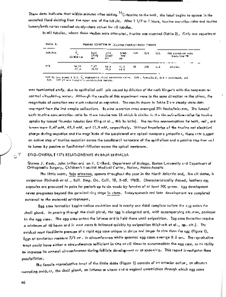 Egg-Oviduct Size Relationships in Raja erinacea Identifier: 11466 Title: Egg-Oviduct Size Relationships in Raja erinacea Author: Thomas J. Koob, Boston University John J. Laffan, Boston University Ian P. Callard, Boston University Date: 1981 Species: Raja erinacea Common Name: Little skate Type: Bulletin, Report Bulletin: Volume 21 - 1981 Report: 27 Citation “Egg-Oviduct Size Relationships in Raja erinacea,” MDI Biological Laboratory, accessed December 14, 2025, https://digitalarchive.mdibl.org/items/show/1347.Item 11466 Save this item as a PDF file