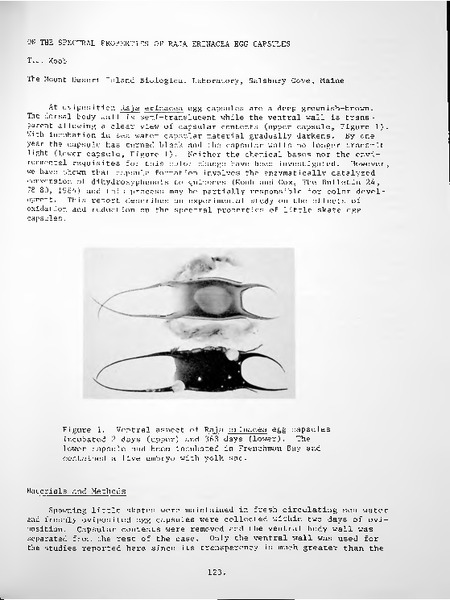 On the Spectral Properties of Raja erinacea Egg Capsules Identifier: 11686 Title: On the Spectral Properties of Raja erinacea Egg Capsules Author: Thomas J. Koob, MDI Biological Laboratory Date: 1985 Species: Raja erinacea Common Name: Little skate Type: Bulletin, Report Bulletin: Volume 25 - 1985 Report: 47 Citation “On the Spectral Properties of Raja erinacea Egg Capsules,” MDI Biological Laboratory, accessed December 15, 2025, https://digitalarchive.mdibl.org/items/show/1568.Item 11686 Save this item as a PDF file