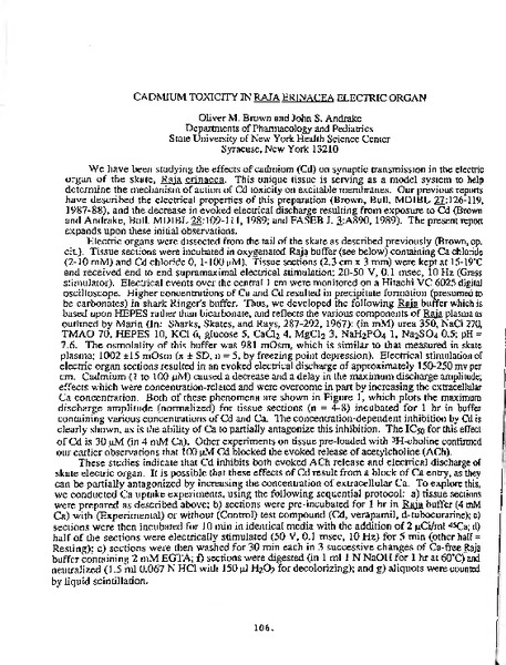 Cadmium Toxicity in Raja erinacea Electric Organ Identifier: 11938 Title: Cadmium Toxicity in Raja erinacea Electric Organ Author: Oliver M. Brown, State University of New York, Health Science Center Syracuse John S. Andrake, State University of New York, Health Science Center Syracuse Date: 1989 Species: Raja erinacea Common Name: Little skate Type: Bulletin, Report Bulletin: Volume 29 - 1989 Report: 48 Citation “Cadmium Toxicity in Raja erinacea Electric Organ,” MDI Biological Laboratory, accessed December 16, 2025, https://digitalarchive.mdibl.org/items/show/1785.Item 11938 Save this item as a PDF file