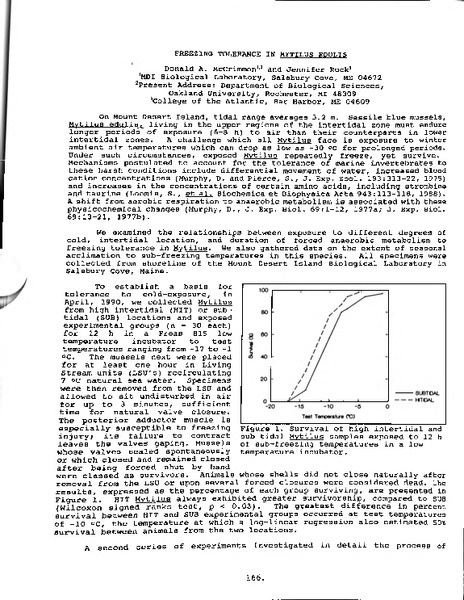 Freezing Tolerance in Mytilus Epulis Identifier: 12082 Title: Freezing Tolerance in Mytilus Epulis Author: Donald A. McCrimmon, MDI Biological Laboratory Jennifer Rock, College of the Atlantic Date: 1991 Species: Mytilus edulis Common Name: Blue mussel Type: Bulletin, Report Bulletin: Volume 31 - 1991 Report: 72 Citation “Freezing Tolerance in Mytilus Epulis,” MDI Biological Laboratory, accessed December 14, 2025, https://digitalarchive.mdibl.org/items/show/1876.Item 12082 Save this item as a PDF file