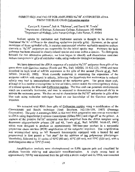 Direct Sequencing of PCR-Amplified Na+/H+ Antiporter cDNA from the Blue Crab Callinectes sapidus