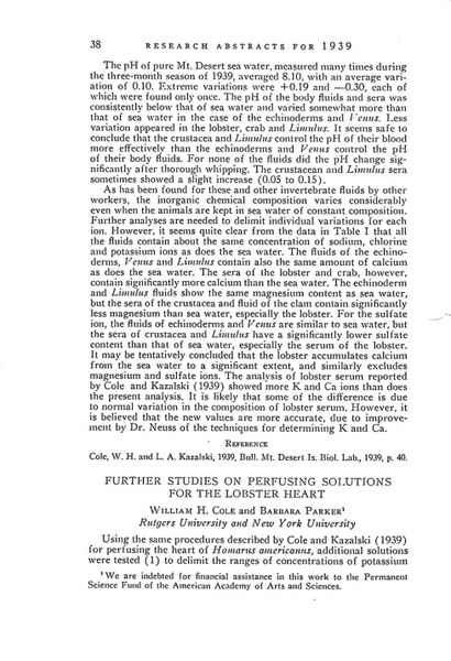 Further Studies on Perfusing Solutions for the Lobster Heart Identifier: 10343 Title: Further Studies on Perfusing Solutions for the Lobster Heart Author: William H. Cole, Rutgers University Barbara Parker, New York University Date: 1939 Species: Homarus americanus Common Name: American lobster Type: Bulletin, Report Bulletin: Volume 03 - 1939 Report: 10 Citation “Further Studies on Perfusing Solutions for the Lobster Heart,” MDI Biological Laboratory, accessed December 14, 2025, https://digitalarchive.mdibl.org/items/show/2121.Item 10343 Save this item as a PDF file