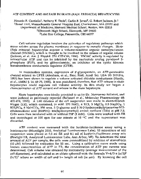 ATP Content and Release in Skate (Raja erinacea) Hepatocytes Identifier: 12345 Title: ATP Content and Release in Skate (Raja erinacea) Hepatocytes Author: Horacio F. Cantiello, Massachusetts General Hospital Bethany K. Dede, Ellsworth High School Carlin F. Jones, Lake Erie College George Robert Jackson, Jr., Massachusetts General Hospital Date: 1996 Species: Raja erinacea Common Name: Little skate Type: Bulletin, Report Bulletin: Volume 36 - 1996 Report: 43 Citation “ATP Content and Release in Skate (Raja erinacea) Hepatocytes,” MDI Biological Laboratory, accessed December 14, 2025, https://digitalarchive.mdibl.org/items/show/2184.Item 12345 Save this item as a PDF file