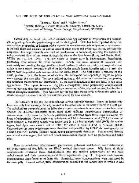 On the Role of Egg Jelly in Raja Erinacea Egg Capsule Identifier: 12420 Title: On the Role of Egg Jelly in Raja Erinacea Egg Capsule Author: Thomas J. Koob, Shriners Hospital J. William Straus, Vassar College Date: 1997 Species: Raja erinacea Common Name: Little skate Type: Bulletin, Report Bulletin: Volume 37 - 1997 Report: 60 Citation “On the Role of Egg Jelly in Raja Erinacea Egg Capsule,” MDI Biological Laboratory, accessed December 15, 2025, https://digitalarchive.mdibl.org/items/show/2259.Item 12420 Save this item as a PDF file