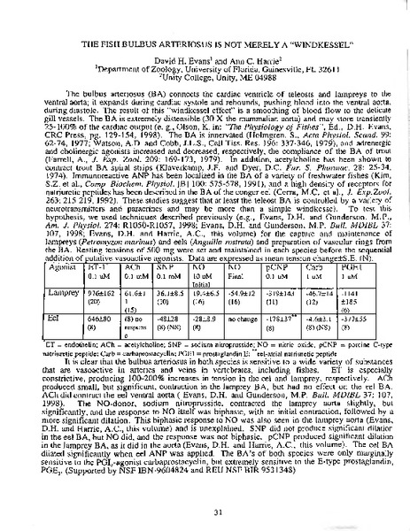 The Fish Bulbus Arteriosus is Not Merely a "Windkessel" Identifier: 12438 Title: The Fish Bulbus Arteriosus is Not Merely a "Windkessel" Author: David H. Evans, University of Florida Ann C. Harrie, Unity College, Unity, ME Date: 1998 Species: Anguilla rostrata Petromyzon marinus Common Name: American eel Sea lamprey Type: Bulletin, Report Bulletin: Volume 38 - 1998 Report: 16 Citation “The Fish Bulbus Arteriosus is Not Merely a "Windkessel",” MDI Biological Laboratory, accessed December 21, 2025, https://digitalarchive.mdibl.org/items/show/2341.Item 12438 Save this item as a PDF file