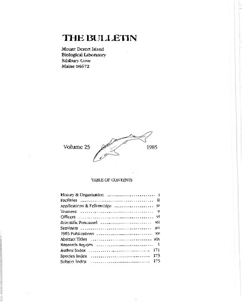 Volume 25 - 1985 Identifier: 10038 Title: Volume 25 - 1985 Date: 1985 Type: Bulletin Imported: Yes ReportsItem 11640 Fluctuation Analysis of Apical K Currents in the Urinary Bladder of the Winter Flounder (Pseudopleuronectes americanus)Item 11641 Slow Biliary Elimination of Methylmercury in the Marine Elasmobranchs , Raja erinacea and Squalus acanthiasItem 11642 Identification and Intracellular Distribution of Aromatase in Eel (Anguilla rostrata) PituitaryItem 11643 Permanent Inactivation of One Microfilament-Dependent Shape Change (Polar Lobe Formation) Without Inactivation of Another (Cytokinesis) in Fertilized Eggs of Ilyanassa obsoletaItem 11644 Renal Protein Excretion in the Aglomerular Toadfish, Opsanus tau: Characterization of Proteins in Plasma and Urine by Polyacrylamide Gel ElectrophoresisItem 11645 Effect of Acetazolamide on Intraocular Pressure in Alewife (Alosa pseudoharengus)See all 63 items Other Attachments 1 Citation “Volume 25 - 1985,” MDI Biological Laboratory, accessed December 14, 2025, https://digitalarchive.mdibl.org/items/show/252.Item 10038 Save this item as a PDF file