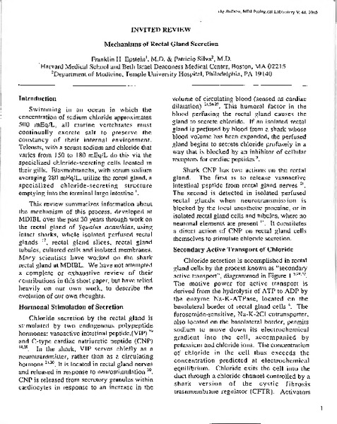Mechanisms of Rectal Gland Secretion Identifier: 12785 Title: Mechanisms of Rectal Gland Secretion Author: Franklin H. Epstein, Harvard University/Beth Israel Hospital Patricio Silva, Temple University Date: 2004 Species: Squalus acanthias Common Name: Spiny dogfish Type: Bulletin, Report Bulletin: Volume 44 - 2004 Report: 1 Citation “Mechanisms of Rectal Gland Secretion,” MDI Biological Laboratory, accessed December 22, 2025, https://digitalarchive.mdibl.org/items/show/2567.Item 12785 Save this item as a PDF file