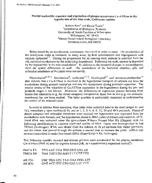 “Partial Nucleotide Sequence and Expression of Plasma Membrane Ca-ATPase in the Hypodermis of the Blue Crab, Callinectes sapidus,” MDI Biological Laboratory, accessed December 22, 2025, https://digitalarchive.mdibl.org/items/show/2582.Item 12800