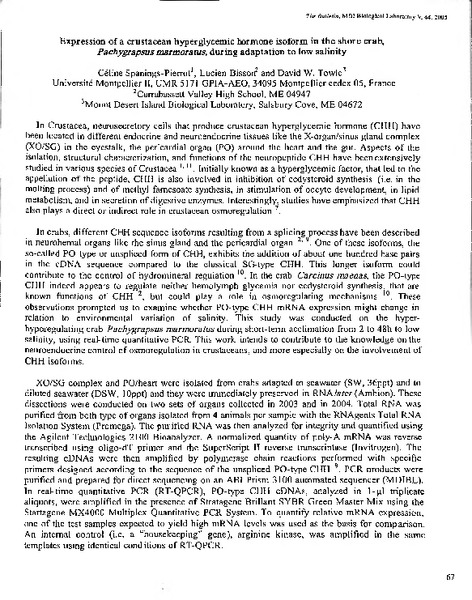 “Expression of a crustacean hyperglycemic hormone isoform in the shore crab, Pachygrapsus marmoratus, during adaptation to low salinity,” MDI Biological Laboratory, accessed December 20, 2025, https://digitalarchive.mdibl.org/items/show/2594.Item 12812