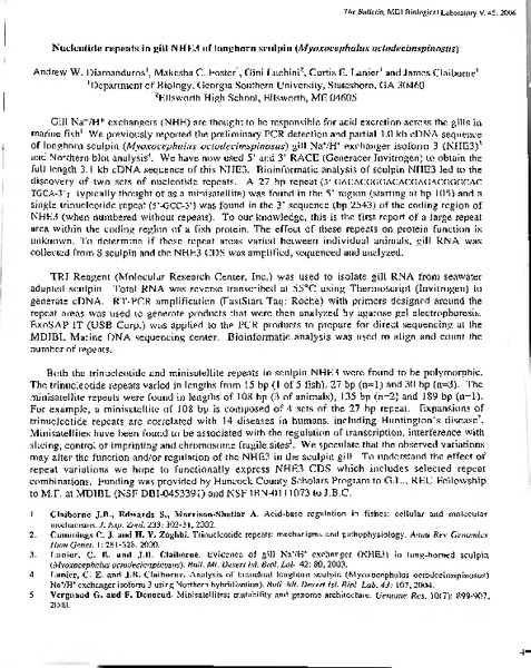 “Nucleotide Repeats in Gill NHE3 of Longhorn sculpin (Myoxocephalus octodecimspinosus),” MDI Biological Laboratory, accessed December 20, 2025, https://digitalarchive.mdibl.org/items/show/2639.Item 12857