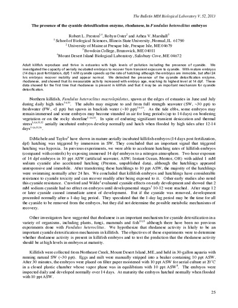 “The Presence of the Cyanide Detoxification Enzyme, Rhodanese, in Fundulus heteroclitus Embryos,” MDI Biological Laboratory, accessed January 28, 2026, https://digitalarchive.mdibl.org/items/show/2690.Item 12988