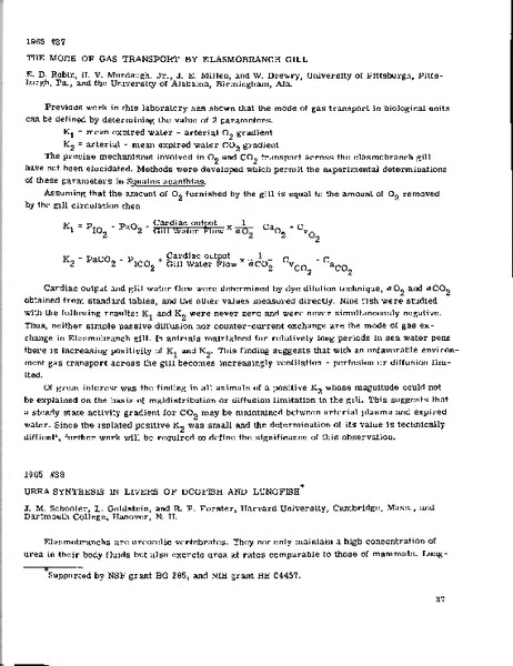 The Mode of Gas Transport by Elasmobranch Gill Identifier: 10749 Title: The Mode of Gas Transport by Elasmobranch Gill Author: Eugene D. RobinUniversity of Pittsburgh J. Eugene MillenUniversity of Pittsburgh William F. DrewryMedical College of Alabama H. Victor Murdaugh, Jr.University of Pittsburgh Date: 1965 Species: Squalus acanthiasSpiny dogfish Type: Bulletin, Report Bulletin: Volume 05 - 1965 Report: 37 Citation “The Mode of Gas Transport by Elasmobranch Gill,” MDI Biological Laboratory, accessed March 22, 2026, https://digitalarchive.mdibl.org/items/show/2756.Item 10749 Save this item as a PDF file