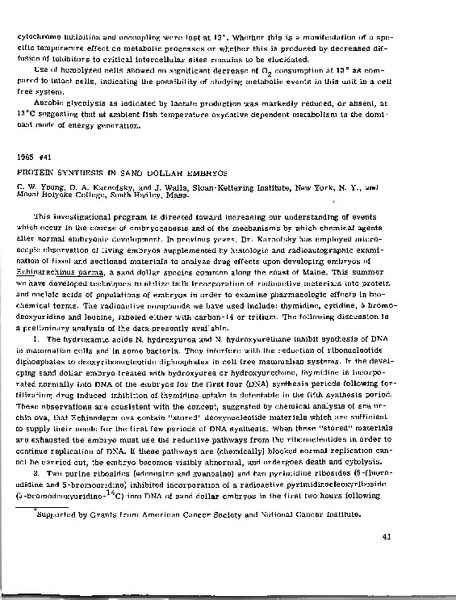 Protein Synthesis in Sand dollar Embryos Identifier: 10753 Title: Protein Synthesis in Sand dollar Embryos Author: Charles W. YoungMemorial Sloan Kettering Cancer Center David A. KarnofskyMemorial Sloan Kettering Cancer Center Joan WallsMount Holyoke College Date: 1965 Species: Echinarachnius parmaSand dollar Type: Bulletin, Report Bulletin: Volume 05 - 1965 Report: 41 Citation “Protein Synthesis in Sand dollar Embryos,” MDI Biological Laboratory, accessed March 20, 2026, https://digitalarchive.mdibl.org/items/show/2760.Item 10753 Save this item as a PDF file