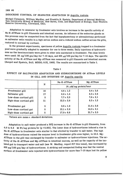 Endocrine Control of Seawater Adaptation in Anguilla rostrata Identifier: 10871 Title: Endocrine Control of Seawater Adaptation in Anguilla rostrata Author: Michael Cynamon, Yale University William C. Mackay, Case Western Reserve University Franklin H. Epstein, Yale University Date: 1969 Species: Anguilla rostrata Common Name: American eel Type: Bulletin, Report Bulletin: Volume 09 - 1969 Report: 6 Citation “Endocrine Control of Seawater Adaptation in Anguilla rostrata,” MDI Biological Laboratory, accessed January 28, 2026, https://digitalarchive.mdibl.org/items/show/2808.Item 10871 Save this item as a PDF file