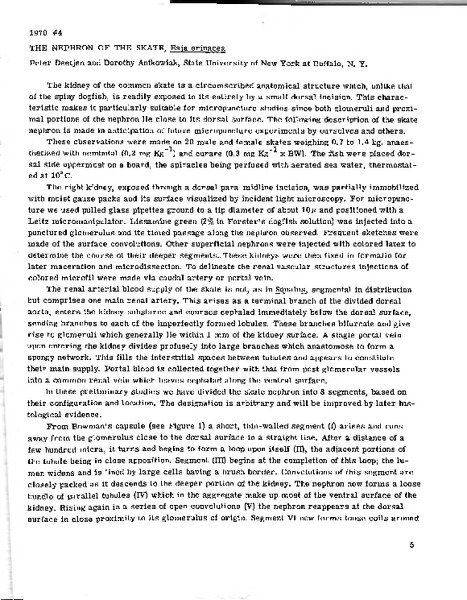 The Nephron of the Skate, Raja erinacea Identifier: 10910 Title: The Nephron of the Skate, Raja erinacea Author: Peter Deetjen, State University of New York, Buffalo Dorothy E. Antkowiak, State University of New York, Buffalo Date: 1970 Species: Raja erinacea Common Name: Little skate Type: Bulletin, Report Bulletin: Volume 10 - 1970 Report: 4 Citation “The Nephron of the Skate, Raja erinacea,” MDI Biological Laboratory, accessed January 28, 2026, https://digitalarchive.mdibl.org/items/show/2884.Item 10910 Save this item as a PDF file