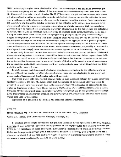 Occurrence of a Virus in Erythrocytes of the Eel, Anguilla Identifier: 10913 Title: Occurrence of a Virus in Erythrocytes of the Eel, Anguilla Author: William L. DoyleUniversity of Chicago Date: 1970 Species: Anguilla rostrataAmerican eel Type: Bulletin, Report Bulletin: Volume 10 - 1970 Report: 7 Citation “Occurrence of a Virus in Erythrocytes of the Eel, Anguilla,” MDI Biological Laboratory, accessed March 19, 2026, https://digitalarchive.mdibl.org/items/show/2887.Item 10913 Save this item as a PDF file