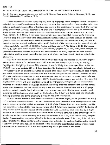 Regulation of Urea Reabsorption in the Elasmobranch Kidney Identifier: 10918 Title: Regulation of Urea Reabsorption in the Elasmobranch Kidney Author: Roy P. ForsterDartmouth College Leon GoldsteinBrown University Jeffrey K. RosenBrown University Date: 1970 Species: Squalus acanthiasSpiny dogfish Type: Bulletin, Report Bulletin: Volume 10 - 1970 Report: 12 Citation “Regulation of Urea Reabsorption in the Elasmobranch Kidney,” MDI Biological Laboratory, accessed March 20, 2026, https://digitalarchive.mdibl.org/items/show/2892.Item 10918 Save this item as a PDF file