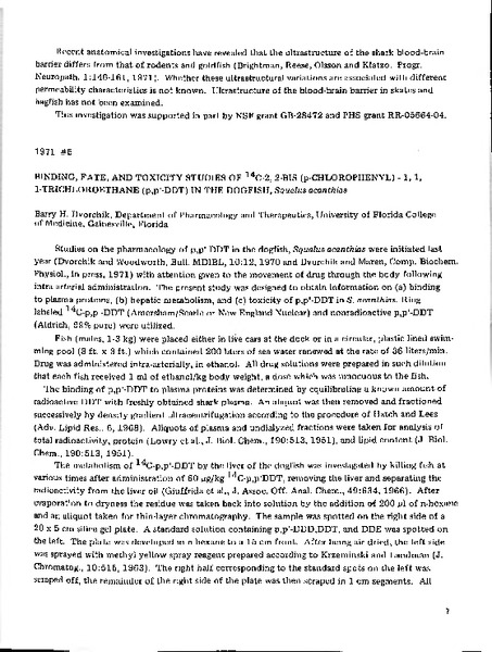 “Binding, Fate, and Toxicity Studies of 14C-2, 2-Bis (p-Chlorophenyl) - 1, 1, 1-Trichloroethane (p,p'-DDT) in the Dogfish, Squalus acanthias,” MDI Biological Laboratory, accessed January 28, 2026, https://digitalarchive.mdibl.org/items/show/2922.Item 10948