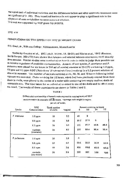Observations on the Effect of DDT in Hermit Crabs Identifier: 11006 Title: Observations on the Effect of DDT in Hermit Crabs Author: William C. Grant, Jr.Williams College Date: 1972 Species: Pagurus acadianusAcadian hermit crab Pagurus pubescensHairy hermit crab Type: Bulletin, Report Bulletin: Volume 12 - 1972 Report: 19 Citation “Observations on the Effect of DDT in Hermit Crabs,” MDI Biological Laboratory, accessed March 19, 2026, https://digitalarchive.mdibl.org/items/show/2980.Item 11006 Save this item as a PDF file