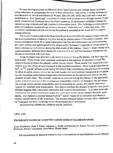Excretion Rates of Trimethylamine Oxide in Elasmobranchs Identifier: 11055 Title: Excretion Rates of Trimethylamine Oxide in Elasmobranchs Author: Leon GoldsteinBrown University Paul J. PalattBrown University Adrienne L. ButlerBrown University Suzanne M. RaperBrown University Date: 1973 Species: Ginglymostoma cirratumNurse shark Negaprion brevirostrisLemon shark Raja erinacea (now Leucoraja erinacea)Little skate Squalus acanthiasSpiny dogfish Type: Bulletin, Report Bulletin: Volume 13 - 1973 Report: 20 Citation “Excretion Rates of Trimethylamine Oxide in Elasmobranchs,” MDI Biological Laboratory, accessed March 17, 2026, https://digitalarchive.mdibl.org/items/show/3029.Item 11055 Save this item as a PDF file