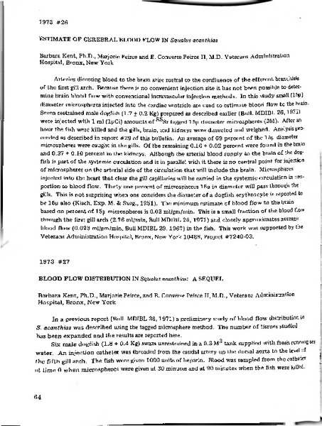 Blood Flow Distribution in Squalus acanthias: A Sequel Identifier: 11062 Title: Blood Flow Distribution in Squalus acanthias: A Sequel Author: Barbara B. KentVeterans Administration Hospital, Bronx, New York Marjorie G. PeirceVeterans Administration Hospital, Bronx, New York E. Converse Peirce, IIVeterans Administration Hospital, Bronx, New York Date: 1973 Species: Squalus acanthiasSpiny dogfish Type: Bulletin, Report Bulletin: Volume 13 - 1973 Report: 27 Citation “Blood Flow Distribution in Squalus acanthias: A Sequel,” MDI Biological Laboratory, accessed March 15, 2026, https://digitalarchive.mdibl.org/items/show/3036.Item 11062 Save this item as a PDF file
