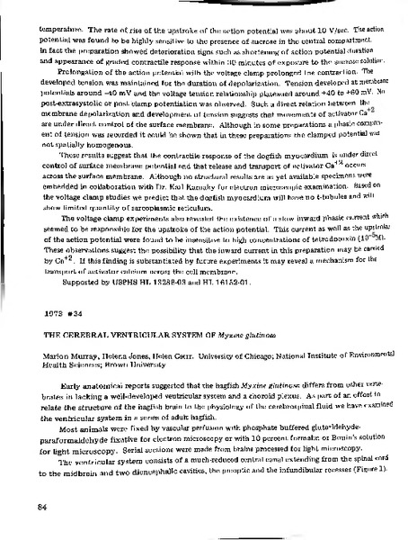 The Cerebral Ventricular System of Myxine glutinosa Identifier: 11069 Title: The Cerebral Ventricular System of Myxine glutinosa Author: Marion MurrayUniversity of Chicago Helena JonesNational Institutes of Environmental Health Sciences Helen F. CserrBrown University Date: 1973 Species: Myxine glutinosaHagfish, Slime eel Type: Bulletin, Report Bulletin: Volume 13 - 1973 Report: 34 Citation “The Cerebral Ventricular System of Myxine glutinosa,” MDI Biological Laboratory, accessed March 21, 2026, https://digitalarchive.mdibl.org/items/show/3043.Item 11069 Save this item as a PDF file