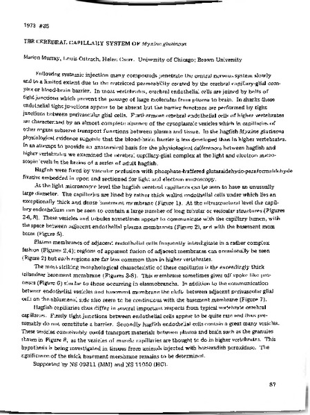 The Cerebral Capillary System of Myxine glutinosa Identifier: 11070 Title: The Cerebral Capillary System of Myxine glutinosa Author: Marion MurrayUniversity of Chicago Louis H. OstrachBrown University Helen F. CserrBrown University Date: 1973 Species: Myxine glutinosaHagfish, Slime eel Type: Bulletin, Report Bulletin: Volume 13 - 1973 Report: 35 Citation “The Cerebral Capillary System of Myxine glutinosa,” MDI Biological Laboratory, accessed March 21, 2026, https://digitalarchive.mdibl.org/items/show/3044.Item 11070 Save this item as a PDF file