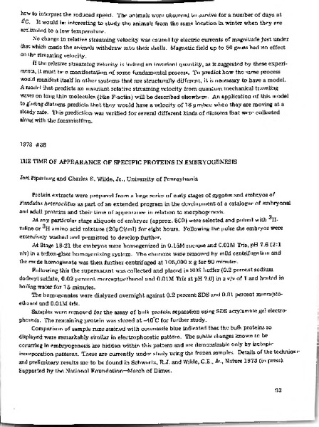 The Time of Appearance of Specific Proteins in Embryogenesis Identifier: 11073 Title: The Time of Appearance of Specific Proteins in Embryogenesis Author: Joel PiperbergUniversity of Pennsylvania Charles E. Wilde, Jr.University of Pennsylvania Date: 1973 Species: Fundulus heteroclitusMummichog Type: Bulletin, Report Bulletin: Volume 13 - 1973 Report: 38 Citation “The Time of Appearance of Specific Proteins in Embryogenesis,” MDI Biological Laboratory, accessed March 22, 2026, https://digitalarchive.mdibl.org/items/show/3047.Item 11073 Save this item as a PDF file