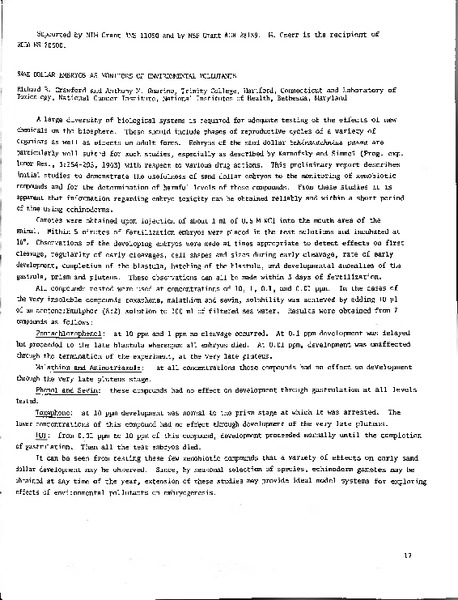 Sand Dollar Embryos as Monitors of Environmental Pollutants Identifier: 11176 Title: Sand Dollar Embryos as Monitors of Environmental Pollutants Author: Richard B. CrawfordTrinity College Anthony M. GuarinoNational Cancer Institute Date: 1976 Species: Echinarachnius parmaSand dollar Type: Bulletin, Report Bulletin: Volume 16 - 1976 Report: 7 Citation “Sand Dollar Embryos as Monitors of Environmental Pollutants,” MDI Biological Laboratory, accessed March 21, 2026, https://digitalarchive.mdibl.org/items/show/3150.Item 11176 Save this item as a PDF file