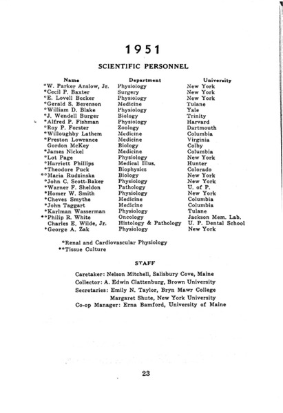 1951 Scientific Personnel, Staff, Seminars Identifier: 12958 Title: 1951 Scientific Personnel, Staff, Seminars Date: 1951 Type: Bulletin, Other Volume: Volume 04 - 1950-1952 Report: 9 Citation “1951 Scientific Personnel, Staff, Seminars,” MDI Biological Laboratory, accessed December 14, 2025, https://digitalarchive.mdibl.org/items/show/445.Item 12958 Save this item as a PDF file