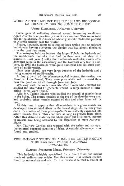 Work at the Mount Desert Island Biological Laboratory During Summer of 1935